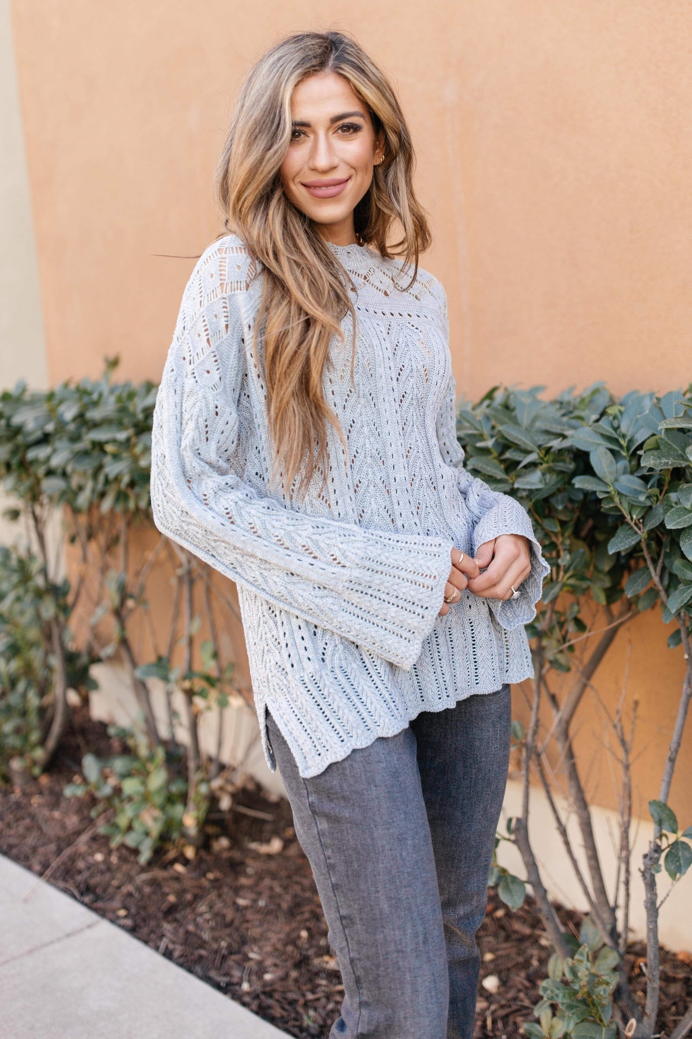 [product]In reality, this sweater has a lot of knitting, but "a bit of knit" rhymed so much better! This top is loose fitting and so lightweight. It features intricate and unique knit stitching patterns all over. It also has a high neckline and wide-cut that gives this sweater a little extra edge!
